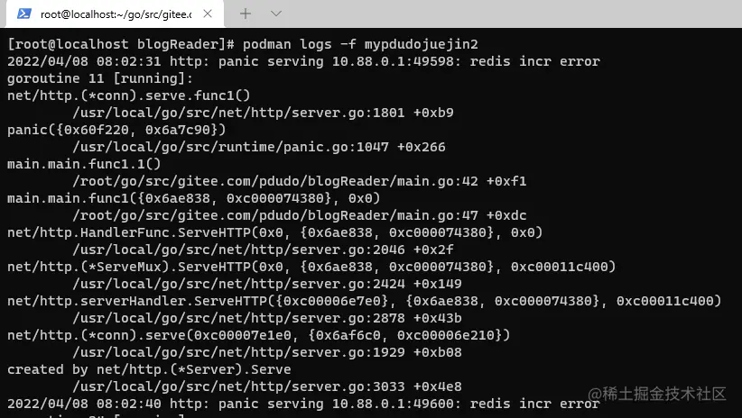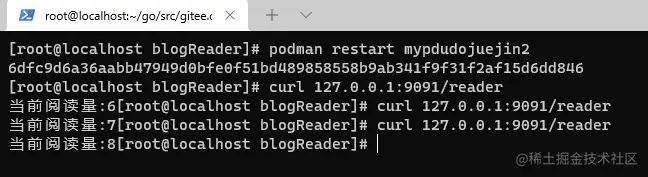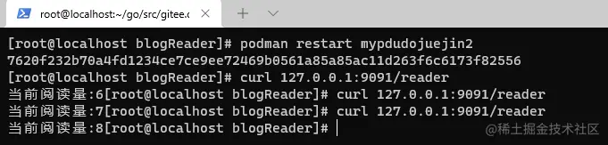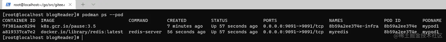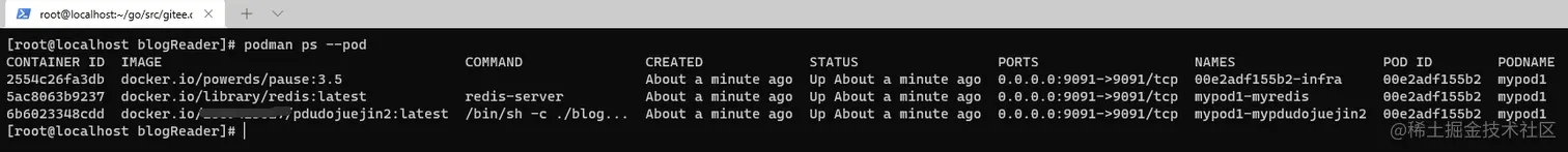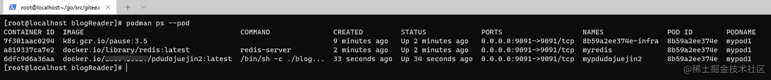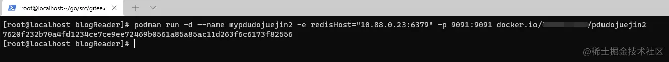 命令: podman run -d --name mypdudojuejin2 -e redisHost="10.88.0.23:6379" -p 9091:9091 容器images