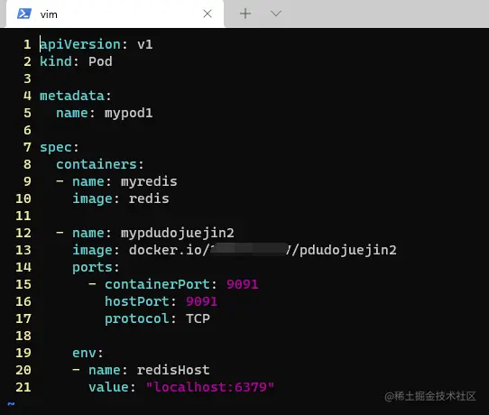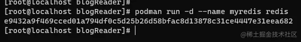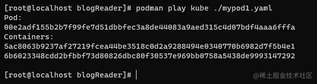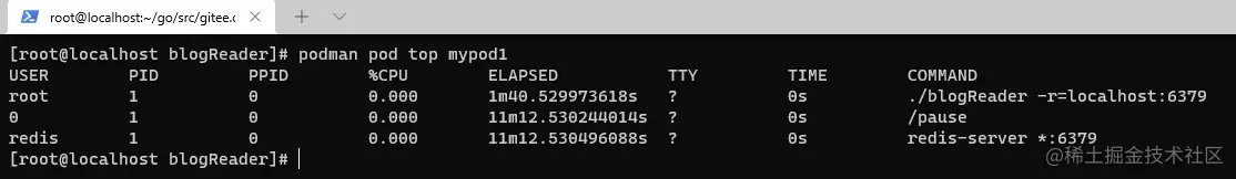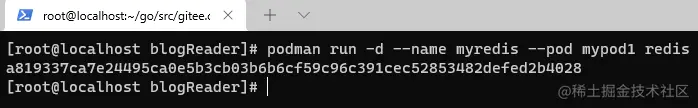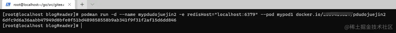 命令: podman run -d --name mypdudojuejin2 -e redisHost="localhost:6379" --pod mypod1 容器image