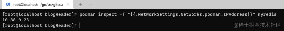 使用如下命令可以获取: podman inspect -f "{{.NetworkSettings.Networks.podman.IPAddress}}" myredis