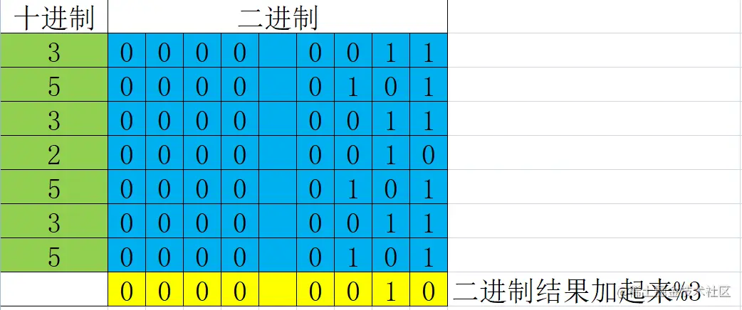 将二进制数,“按列”加起来对3进行取余,若是0则不管它,若是1,则这个位数正是我们需要的数,将它转换为10进制,最后将此结果返回回去即可