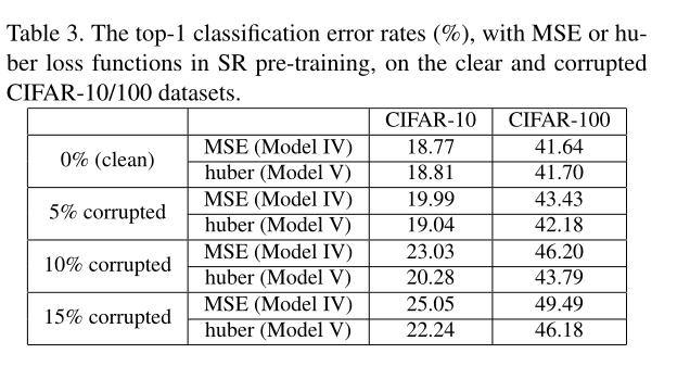 2.在SR自网络预训练中使用的损失函数是MSE,对异常值敏感,后文给出的解释是LR给出的典型特征过少不足以给出数据流形(mainfold)。提到了一种针对异常值的损失函数, 指出了correntropy-induced loss function,用huber和MSE两种损失函数做了对比。