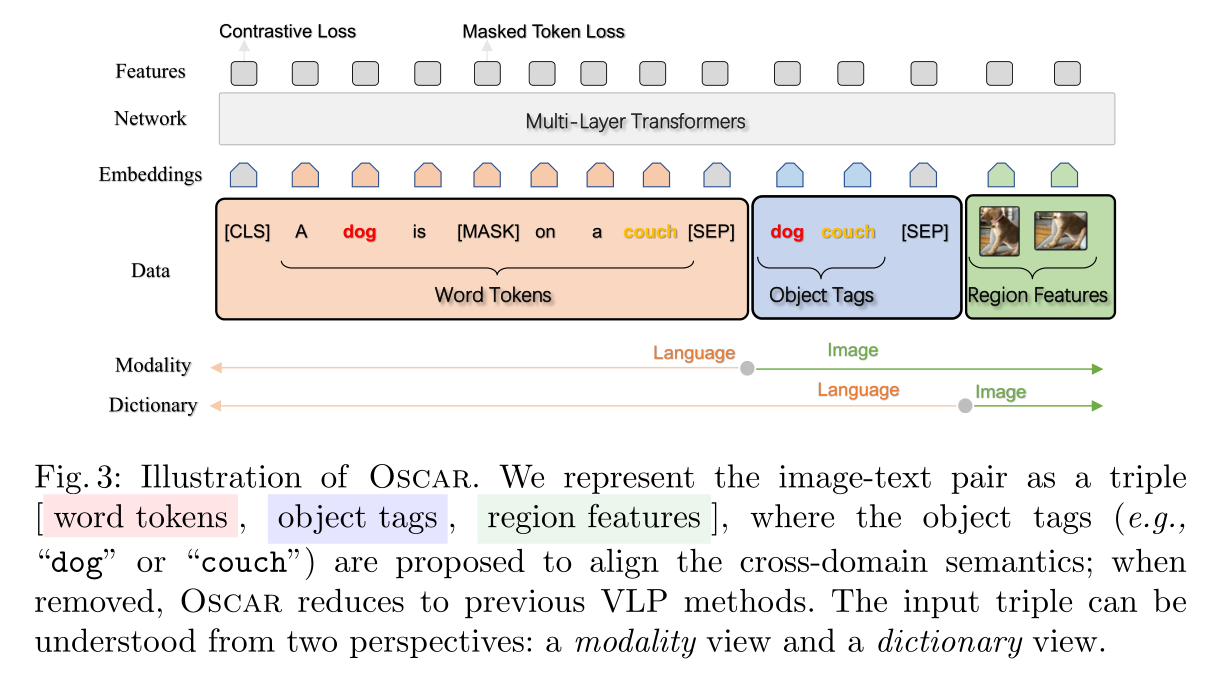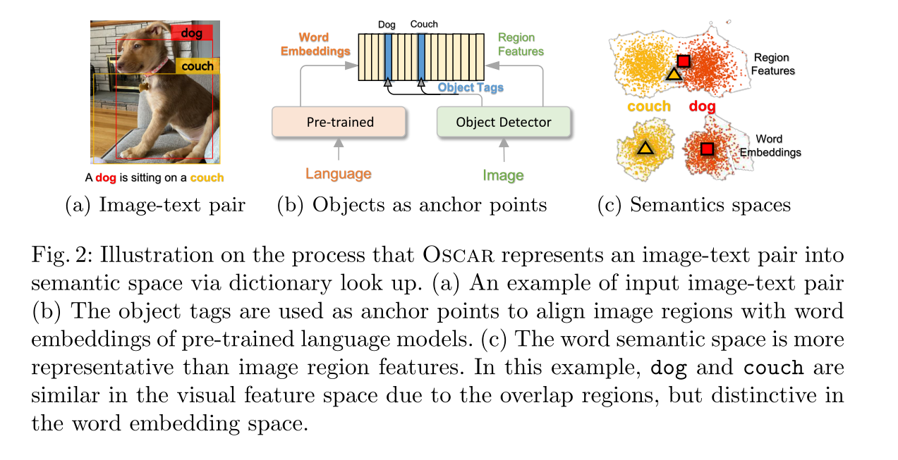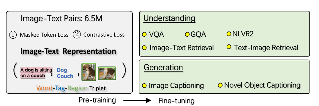 当前视觉语言任务常用 大规模预训练模型+多模态表示(这里指image-text pair)。他们结合的比较暴力(图文简单拼接+self-attention机制),我们的核心idea就是引入了目标识别生成的tag 作为锚点降低了对齐难度。
