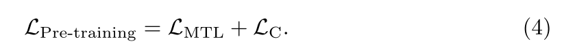 定义了一个discrete token sequence as h=[w,q],使用了Masked Token Loss (MTL) 。每个iteration中随机mask 15%的h,以token[MASK]代替。训练模型基于临近token和全部图像特征v通过最