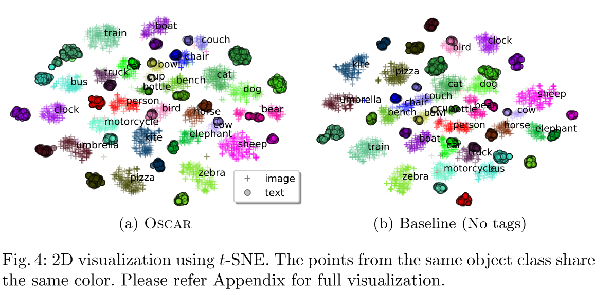 下标可视化了COCO test set上习得的图文对 语义特征空间,并比较了使用/不适用tag进行预训练
