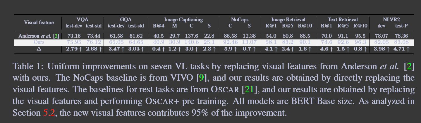 结果:以Oscar_B+R101-C4作为baseline——OSCAR+ pre-training contributes 5%,vision pre-training (improved visual features) 95%