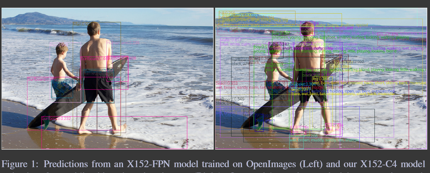 Figure1意在表明和其他的经典OD模型相比(X152-FPN),我们的模型可以编码更多的目标和概念(下图含1848目标类和524条属性)