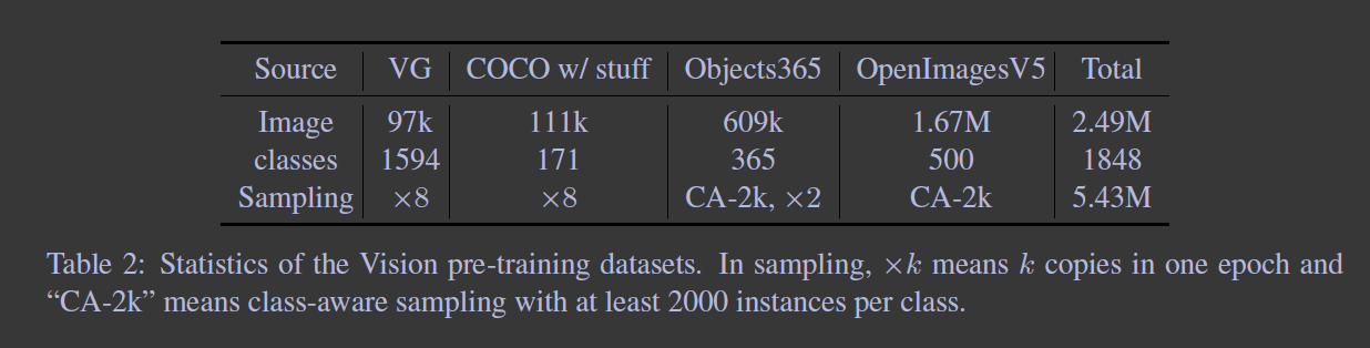 1. 对OpenImages和Object365做了一个类显著?(class-aware)的采样保证每类至少有2000张,采出了2.2M张和0.8M张