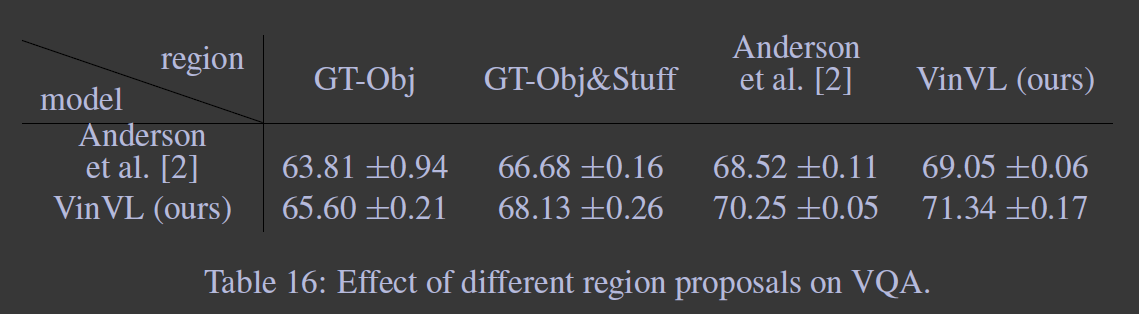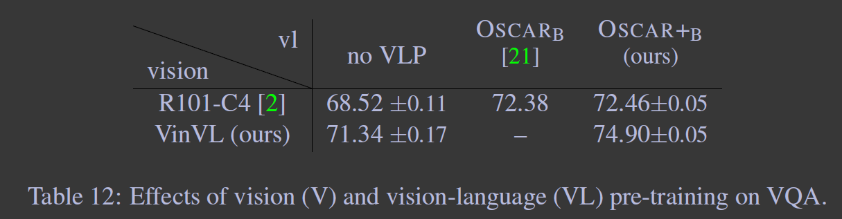 以no VLP+R101-C4作为baseline——VinVL和VLP的贡献是加和(additive)的(74.90-68.52≈2.82+3.94)。这个证明了VinVL的可推广性