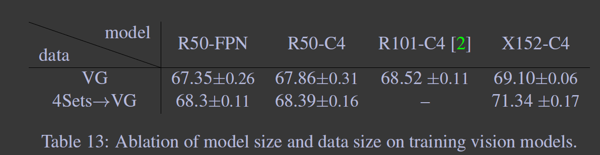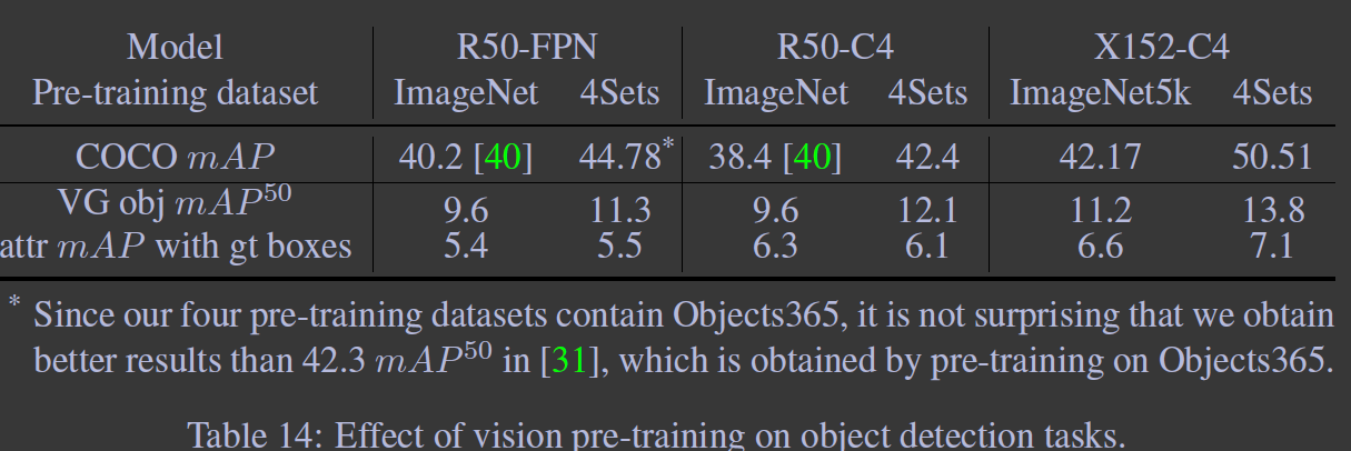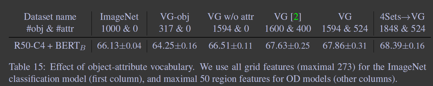 结果:有一个取舍问题,GT之类的框位置准但是框的东西少,基于VG-trained的模型框的位置不准但是框的多。作者强调VL领域的OD task不同于经典的OD task需要更多的视觉语义信息去和(丰富得多的)语言语义信息去对齐。并再次证明了V的部分训练时需要尽可能多的词。