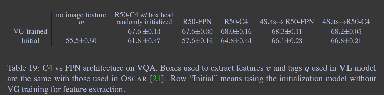 Although有论文指出FPN比C4好,但对于VL task C4的特征更有效,实验发现原因在于:1. C4的特征提取层都是在ImageNet预训练的 2.CNN的结构(a better inductive bias)比MLP的结构在编码视觉信息方面更好