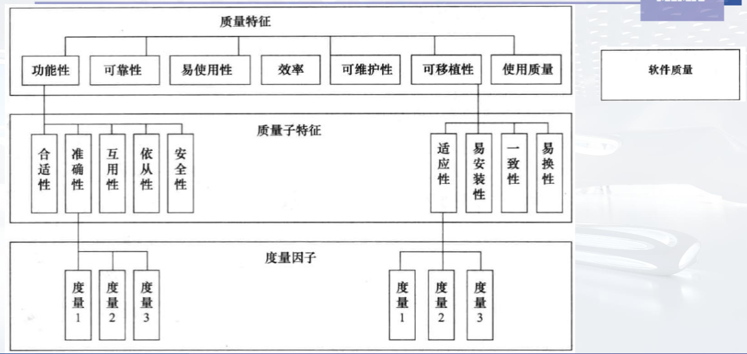 软件质量框架是一个“质量特征一质量子特征一度量因子”的三层结构模型