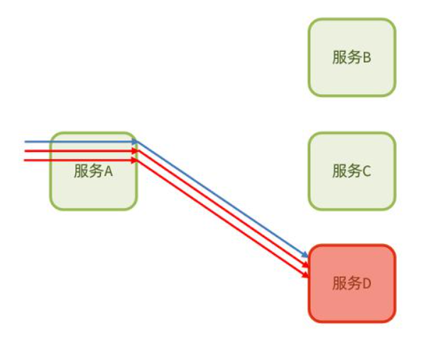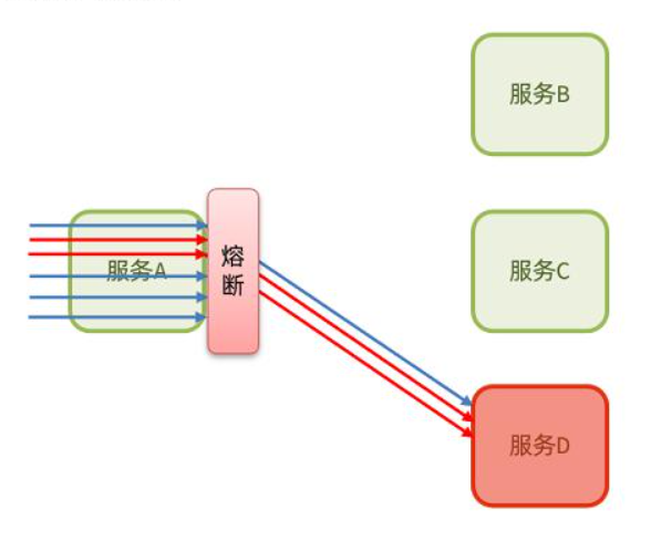 当访问服务D的请求异常比例过高,任务服务D有导致雪崩的风险,会拦截访问服务D的一切请求,形成熔断: