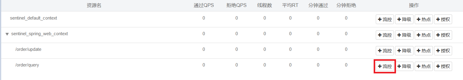 流控、熔断都是针对簇点链路中的资源来设置的,因此我们可以点击对应资源后面的按钮来设置规则。