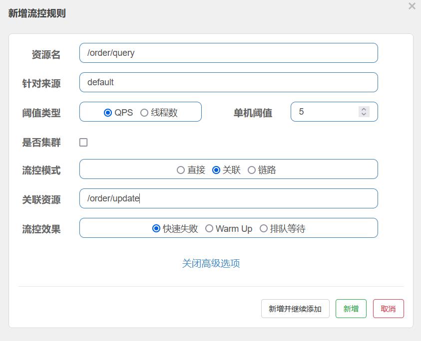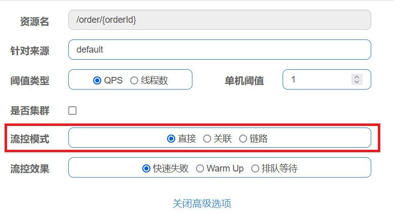再添加限流规则时,点击高级选项,可以选择三种流控模式:
