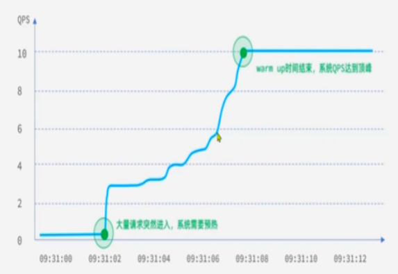 (i)warm-up 预热模式:warm-up是应对服务冷启动的一种方案(加入一个服务器的QPS是10,当这个服务器刚刚启动时,不能让访问它的QPS瞬间达到10,这样会损伤服务器,而是慢慢的加大访问它的QPS),请求阈值初始值是threshold/coldFactor,持续指定时长后,逐渐提高到threshold值,而coldFactor的默认值是3。