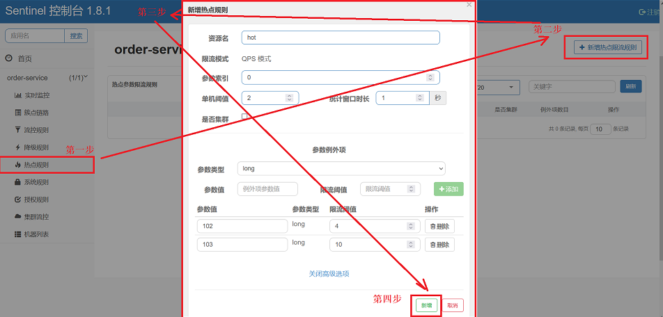 注意,点击簇点链路中某资源的热点按钮是不会有高级选项这个设置的,我们需要点击zuoce的热点规则,然后点击新增热点规则才会有高级选项这个设置: