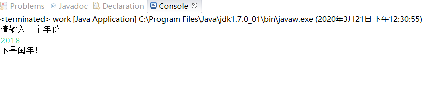package class1; import java.util.*; public class work { public static void main(String[] args) { Scanner input=new Scanner(System.in); System.out.println("请输入一个年份"); int year=input.nextInt(); if((year%4==0&&year%100!=0)||(year%400==0)) { System.out.println("是闰年!"); }else { System.out.println("不是闰年!"); } } }