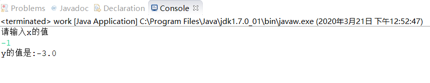 package class1; import java.util.*; public class work { public static void main(String[] args) { Scanner input=new Scanner(System.in); System.out.println("请输入x的值"); double x=input.nextDouble(); if(x>0){ System.out.println("y的值是:"+(x+3)); }else if(x==0){ System.out.println("y的值是:0"); }else if(x<0){ System.out.println("y的值是:"+(2*x-1)); } } }