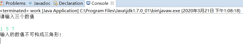 package class1; import java.util.*; public class work { public static void main(String[] args) { Scanner input=new Scanner(System.in); System.out.println("请输入三个数值"); double a=input.nextDouble(); double b=input.nextDouble(); double c=input.nextDouble(); if(a+b>c&&a+c>b&&b+c>a){ System.out.println("输入的数值可构成三角形!"); }else{ System.out.println("输入的数值不可构成三角形!"); } } }