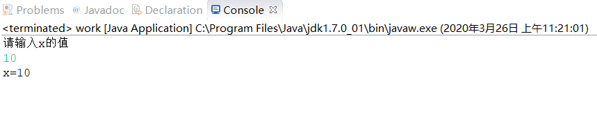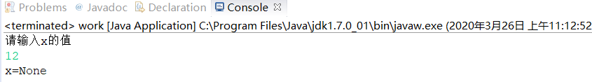 package class1; import java.util.*; public class work { public static void main(String[] args) { Scanner input=new Scanner(System.in); System.out.println("请输入x的值"); int x=input.nextInt(); if(x==1){ System.out.println("x=1"); }else if(x==5){ System.out.println("x=5"); }else if(x==10){ System.out.println("x=10"); }else if(x!=1&&x!=5&&x!=10){ System.out.println("x=None"); } } }