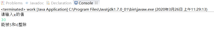 package class1; import java.util.*; public class work { public static void main(String[] args) { Scanner input=new Scanner(System.in); System.out.println("请输入x的值"); double x=input.nextDouble(); if(x%5==0&&x%6==0){ System.out.println("能被5和6整除"); }else if(x%5==0&&x%6!=0){ System.out.println("能被5整除"); }else if(x%5!=0&&x%6==0){ System.out.println("能被6整除"); }else if(x%5!=0&&x%6!=0){ System.out.println("不能被5或6整除"); } } }
