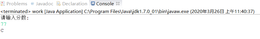 package class1; import java.util.*; public class work { public static void main(String[] args) { Scanner input=new Scanner(System.in); System.out.println("请输入分数:"); double g=input.nextDouble(); if(g<=100&&g>=90){ System.out.println("A"); }else if(g<=89&&g>=80){ System.out.println("B"); }else if(g<=79&&g>=70){ System.out.println("C"); }else if(g<=69&&g>=60){ System.out.println("D"); }else if(g<=59){ System.out.println("E"); }else if(g>100||g<0){ System.out.println("分数无效!"); } } }