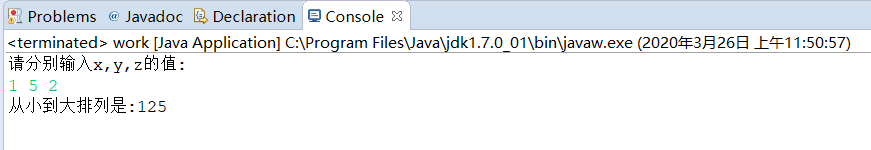 package class1; import java.util.*; public class work { public static void main(String[] args) { Scanner input=new Scanner(System.in); System.out.println("请分别输入x,y,z的值:"); int x= input.nextInt(); int y= input.nextInt(); int z= input.nextInt(); int a=0; if(x>y){ a=x; x=y; y=z; }else if(x>z){ a=x; x=z; z=a; }else if(y>z){ a=y; y=z; z=a; } System.out.println("从小到大排列是:"+x+""+y+""+z); } }