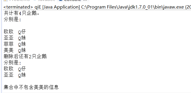 package kkk; import java.util.ArrayList; public class qiE { public static void main(String[] args) { ArrayList<String> list=new ArrayList<String>(); list.add("欧欧 Q仔"); list.add("亚亚 Q妹"); list.add("菲菲 Q妹"); list.add("美美 Q妹"); System.out.println("共计有"+list.size()+"只企鹅。"); System.out.println("分别是:"); System.out.println(); for (int i = 0; i < list.size(); i++) { System.out.println(list.get(i)); } list.remove("菲菲 Q妹"); list.remove("美美 Q妹"); System.out.println("删除后还有2只企鹅"); System.out.println("分别是:"); for (int i = 0; i < list.size(); i++) { System.out.println(list.get(i)); } System.out.println(); if(list.contains("美美 Q妹")) System.out.println("集合中包含美美的信息"); else System.out.println("集合中不包含美美的信息"); } }