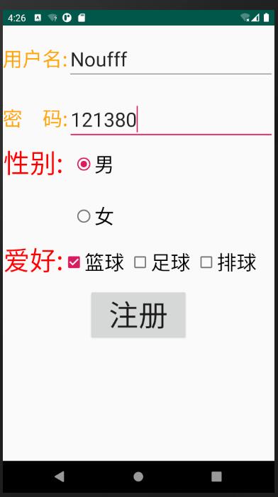 <RelativeLayout xmlns:android="http://schemas.android.com/apk/res/android" xmlns:tools="http://schemas.android.com/tools" android:layout_width="match_parent" android:layout_height="match_parent" tools:context=".MainActivity"> <TextView android:id="@+id/tv1" android:layout_width="wrap_content" android:layout_height="wrap_content" android:text="用户名:" android:textSize="30dp" android:layout_marginTop="30dp" android:textColor="#FFA500" /> <EditText android:layout_width="600dp" android:layout_height="wrap_content" android:id="@+id/et1" android:layout_toRightOf="@id/tv1" android:layout_marginTop="20dp" android:textSize="30dp" /> <TextView android:id="@+id/tv2" android:layout_width="wrap_content" android:layout_height="wrap_content" android:text="密 码:" android:textSize="30dp" android:layout_marginTop="50dp" android:layout_below="@+id/tv1" android:textColor="#FFA500" /> <EditText android:id="@+id/et2" android:layout_width="600dp" android:layout_height="wrap_content" android:layout_toRightOf="@+id/tv2" android:layout_marginTop="30dp" android:textSize="30dp" android:layout_below="@+id/et1" /> <TextView android:layout_width="wrap_content" android:layout_height="wrap_content" android:text="性别:" android:layout_marginLeft="1dp" android:layout_below="@id/tv2" android:layout_marginTop="20dp" android:textSize="40dp" android:textColor="#FF0000"/> <RadioGroup android:id="@+id/rb" android:layout_width="197dp" android:layout_height="wrap_content" android:layout_below="@id/tv2" android:layout_centerHorizontal="true" android:layout_marginTop="10dp"> <RadioButton android:id="@+id/rb1" android:layout_width="97dp" android:layout_height="79dp" android:text="男" android:textSize="30dp"/> <RadioButton android:id="@+id/rb2" android:layout_width="97dp" android:layout_height="79dp" android:text="女" android:textSize="30dp" /> </RadioGroup> <TextView android:id="@+id/tv3" android:layout_width="wrap_content" android:layout_height="wrap_content" android:text="爱好:" android:layout_below="@id/rb" android:textSize="40dp" android:layout_marginLeft="1dp" android:textColor="#FF0000"/> <CheckBox android:layout_width="100dp" android:layout_height="60dp" android:id="@+id/cb1" android:layout_toRightOf="@id/tv3" android:layout_below="@id/rb" android:text="篮球" android:textSize="30dp" /> <CheckBox android:layout_width="100dp" android:layout_height="60dp" android:id="@+id/cb2" android:layout_toRightOf="@id/cb1" android:layout_below="@id/rb" android:text="足球" android:textSize="30dp" /> <CheckBox android:layout_width="100dp" android:layout_height="60dp" android:id="@+id/cb3" android:layout_toRightOf="@id/cb2" android:layout_below="@id/rb" android:text="排球" android:textSize="30dp" /> <Button android:layout_width="150dp" android:layout_height="wrap_content" android:layout_below="@id/cb1" android:layout_centerHorizontal="true" android:text="注册" android:textSize="45dp" android:onClick="click" android:layout_marginTop="10dp" /> </RelativeLayout>