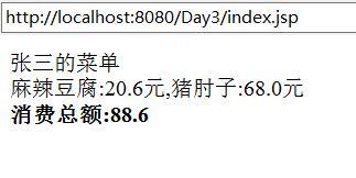 <%@ page language="java" import="java.util.*" pageEncoding="utf-8"%> <%@ page import="java.util.regex.Pattern"%> <%@ page import="java.util.regex.Matcher"%> <%!public double getPirceSum(String input) { Pattern pattern; Matcher matcher; String regex = "-?[0-9][0-9]*[.]?[0-9]*"; pattern = Pattern.compile(regex); matcher = pattern.matcher(input); double sum = 0; while (matcher.find()) { String str = matcher.group(); sum += Double.parseDouble(str); } return sum; }%> <!DOCTYPE HTML PUBLIC "-//W3C//DTD HTML 4.01 Transitional//EN"> <html> <head> </head> <body> 张三的菜单 <br> <% String str = "麻辣豆腐:20.6元,猪肘子:68.0元"; %> <%=str%><br> <b>消费总额:<%=getPirceSum(str)%></b> </body> </html>