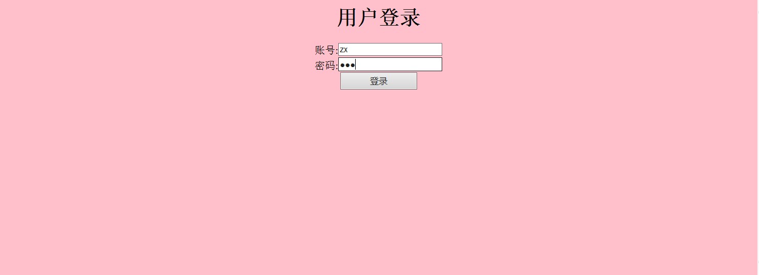 <%@ page language="java" import="java.util.*" pageEncoding="utf-8"%> <!DOCTYPE HTML PUBLIC "-//W3C//DTD HTML 4.01 Transitional//EN"> <html> <head> <style type="text/css"> div{ text-align: center; margin: 0 auto; } .password{ width:203px; } body{ background: pink; } .sub{ width:150px; } </style> </head> <body> <div> <h1>用户登录</h1> <form action="dologin.jsp" method="post"> 账号:<input type="text" name="uname" class="name"><br> 密码:<input type="password" name="upassword" class="password"><br> <input type="submit" value="登录" class="sub"> </form> </div> </body> </html>