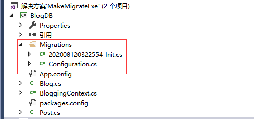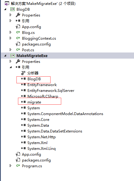 注意点:(1)两个项目都安装了EF6.2.0;(2)在MakeMigrateExe中引用BlogDB和migrate.exe。