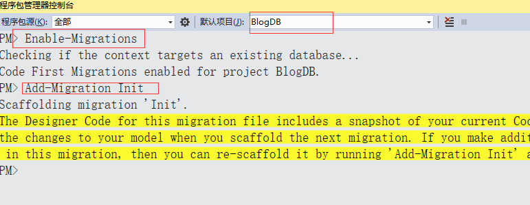 1、首先在程序包管理器控制台对类库项目BlogDB执行迁移