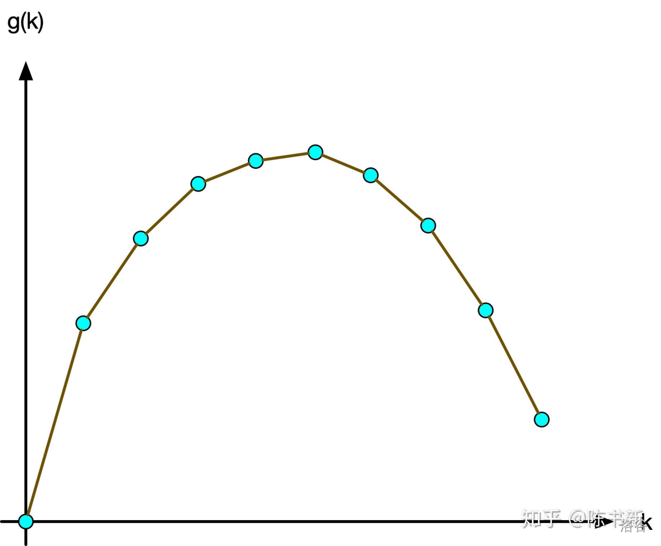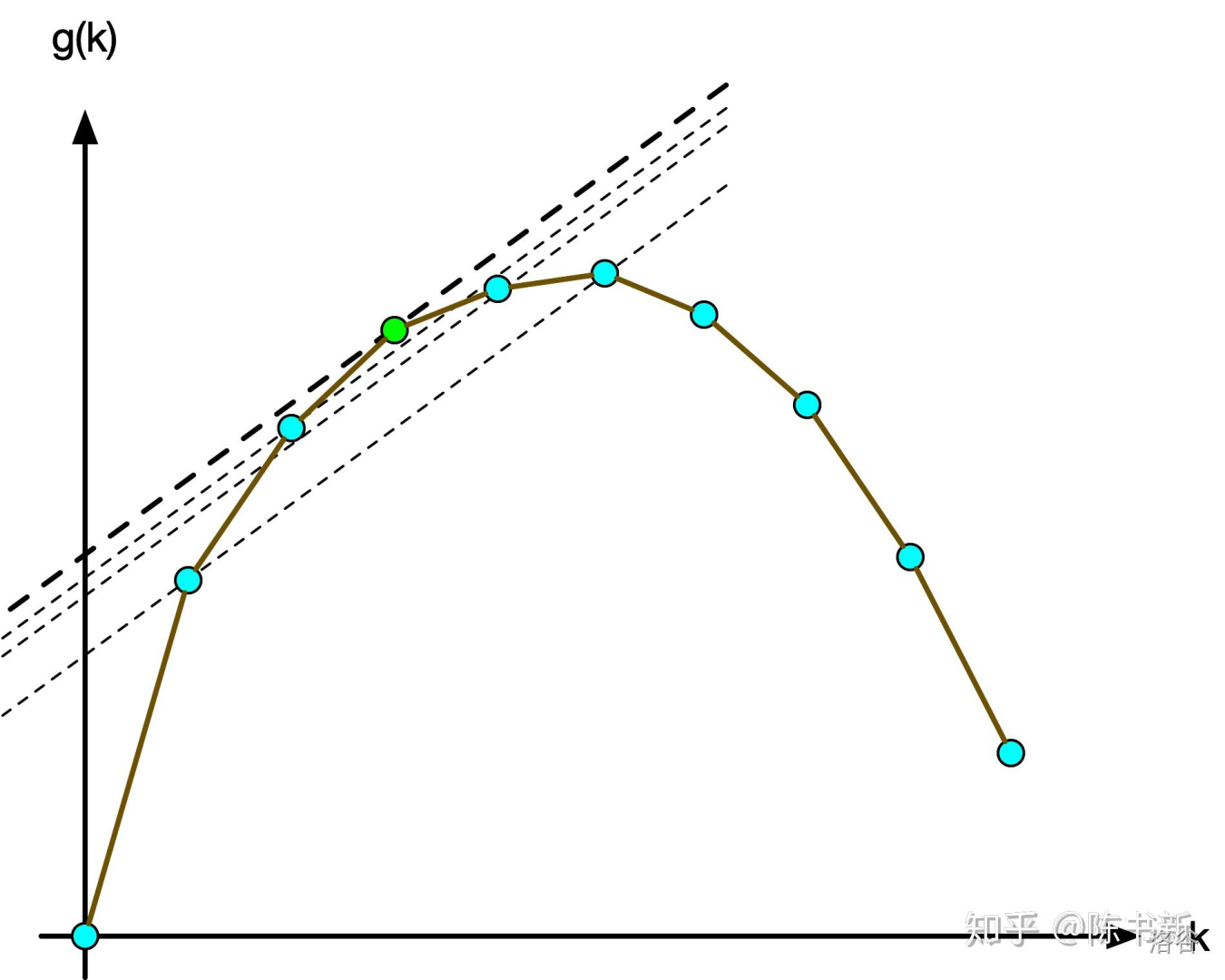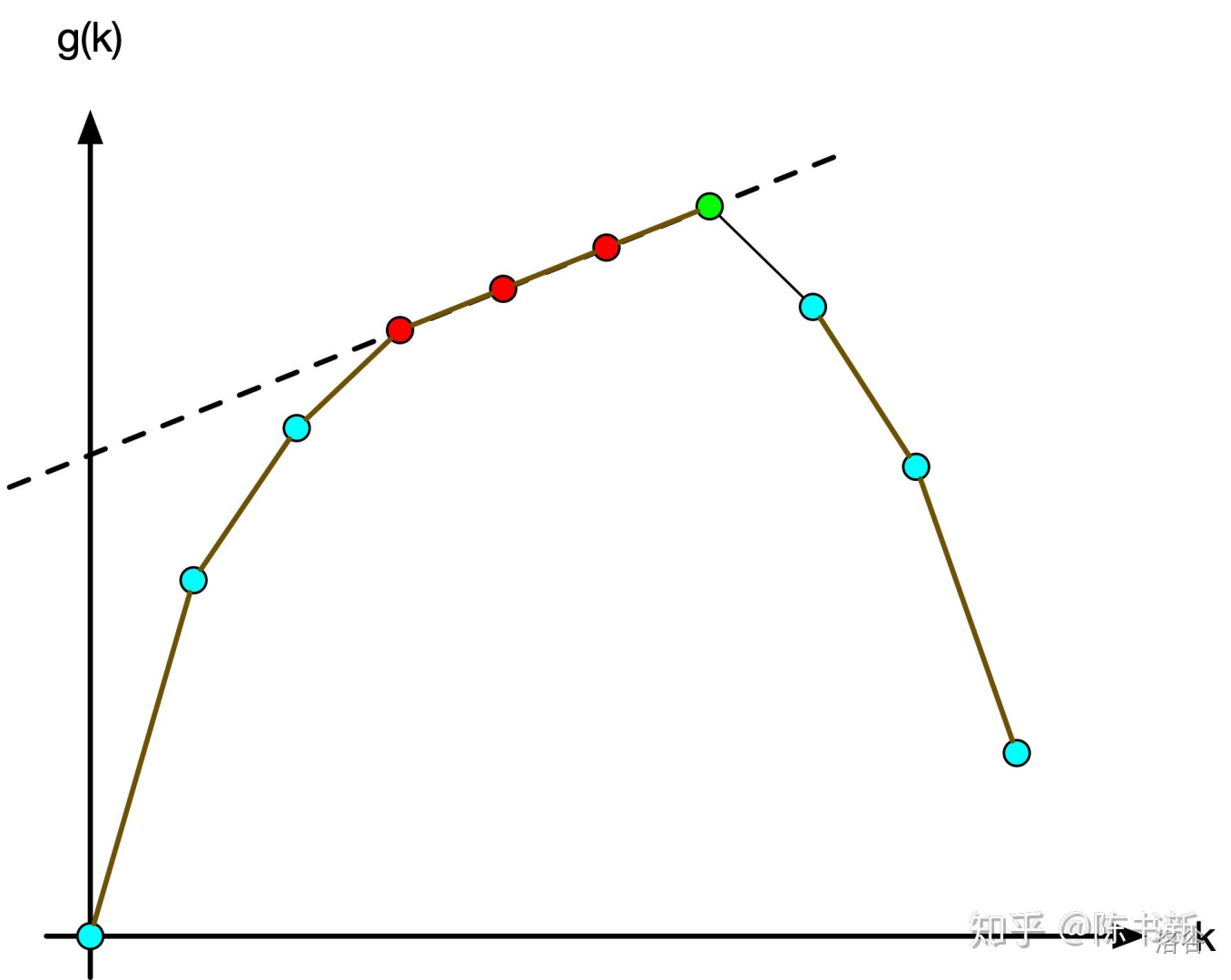 其实很简单,例如对于这个上凸函数,我们在跑全局最优解的前提下,我们使得选中的数尽量大,那么 check 出的横坐标天然落在绿点上。对于判定 check 函数是否合法,我们这么写: