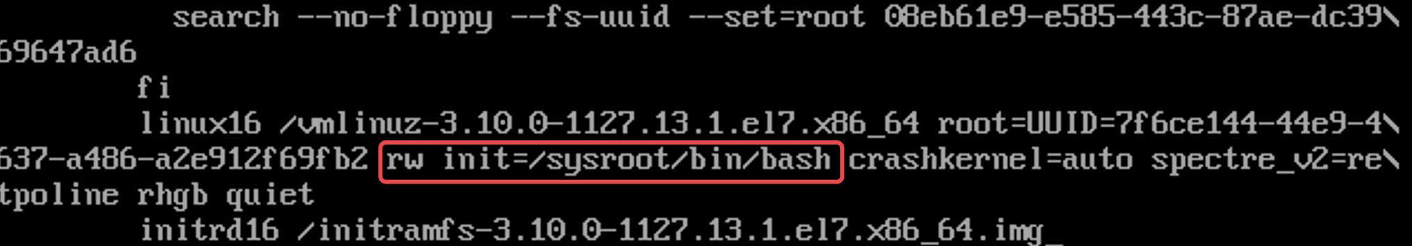 ro,用rw init=/sysroot/bin/bash替换,不要遗漏空格。