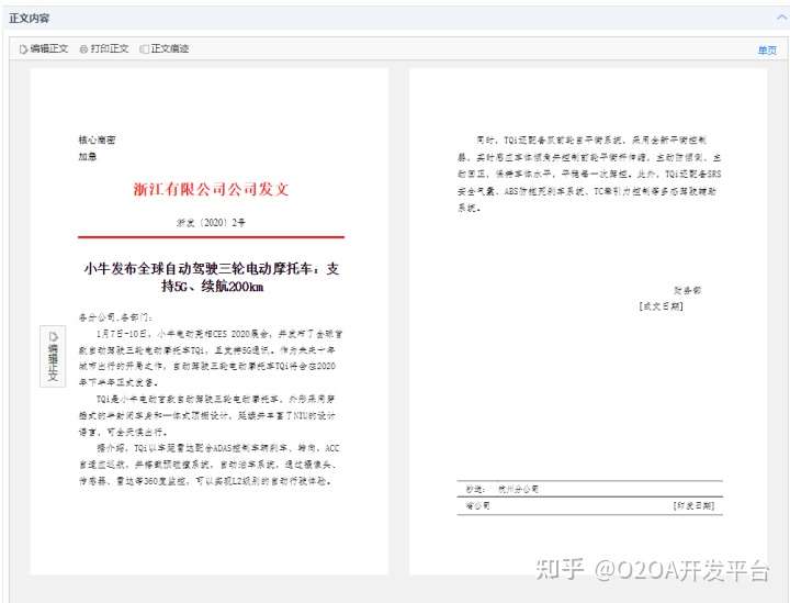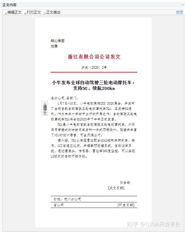 O2OA协同办公系统自带的公文编辑器(版式控件)则提供了多种国标红头模板,可以使用HTML编辑器直接编辑正文,并以HTML格式直接保存,同时可以转换成WORD、PDF格式;为了保证文本的安全性,可以自由设置编辑权限,并且保留内容动态痕迹;以下还有单双页显示的示例。