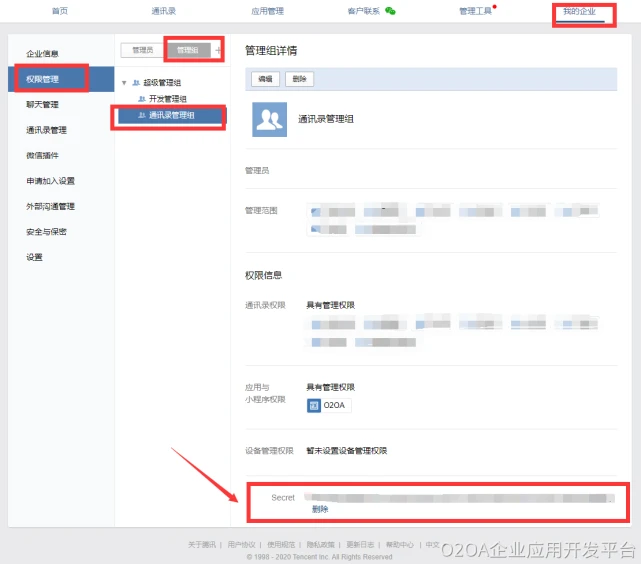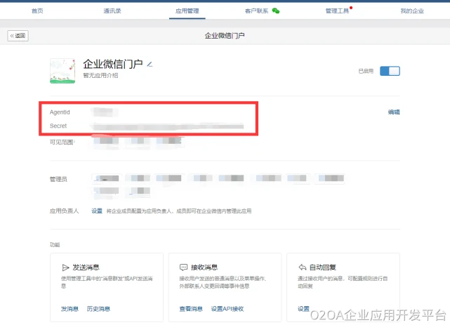 创建完成后,需记住AgentId和Secret(此secret为O2OA配置文件qiyeweixin.json里的corpSecret参数的值),下面配置有用到,如下图所示: