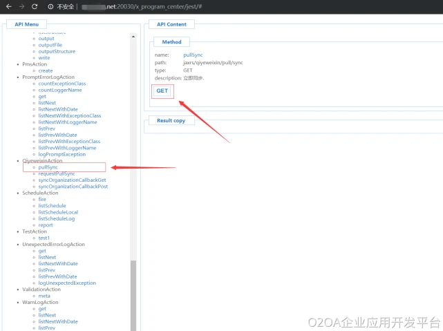 如下图所示界面,点击GET之后,观察服务器控制台或者日志文件信息(o2server/logs),可以查看到同步日志。