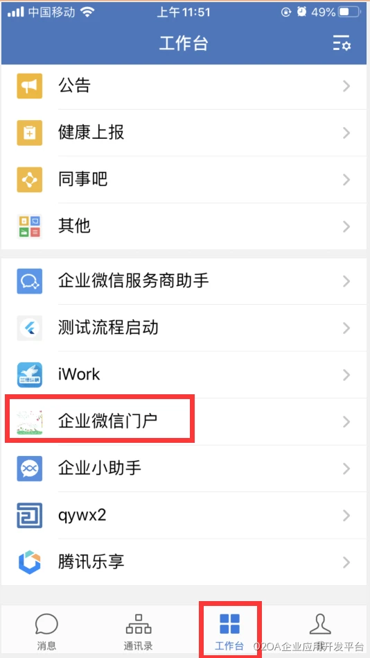 这个url是:http://[host]:[port]/x_desktop/qiyeweixinsso.html?redirect=portalmobile.html?id=************ 这样的形式。后面跟了一个redirect参数,就是需要跳转到一个门户页面,id就是门户(应用市场企业微信门户)标识