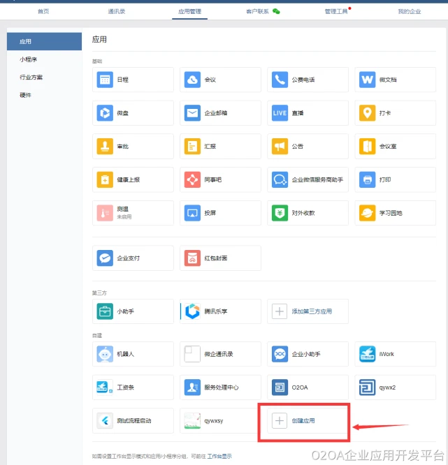 首先使用管理员账号登录企业微信,切换到“应用管理”页签,点击“创建应用”,如下图所示: