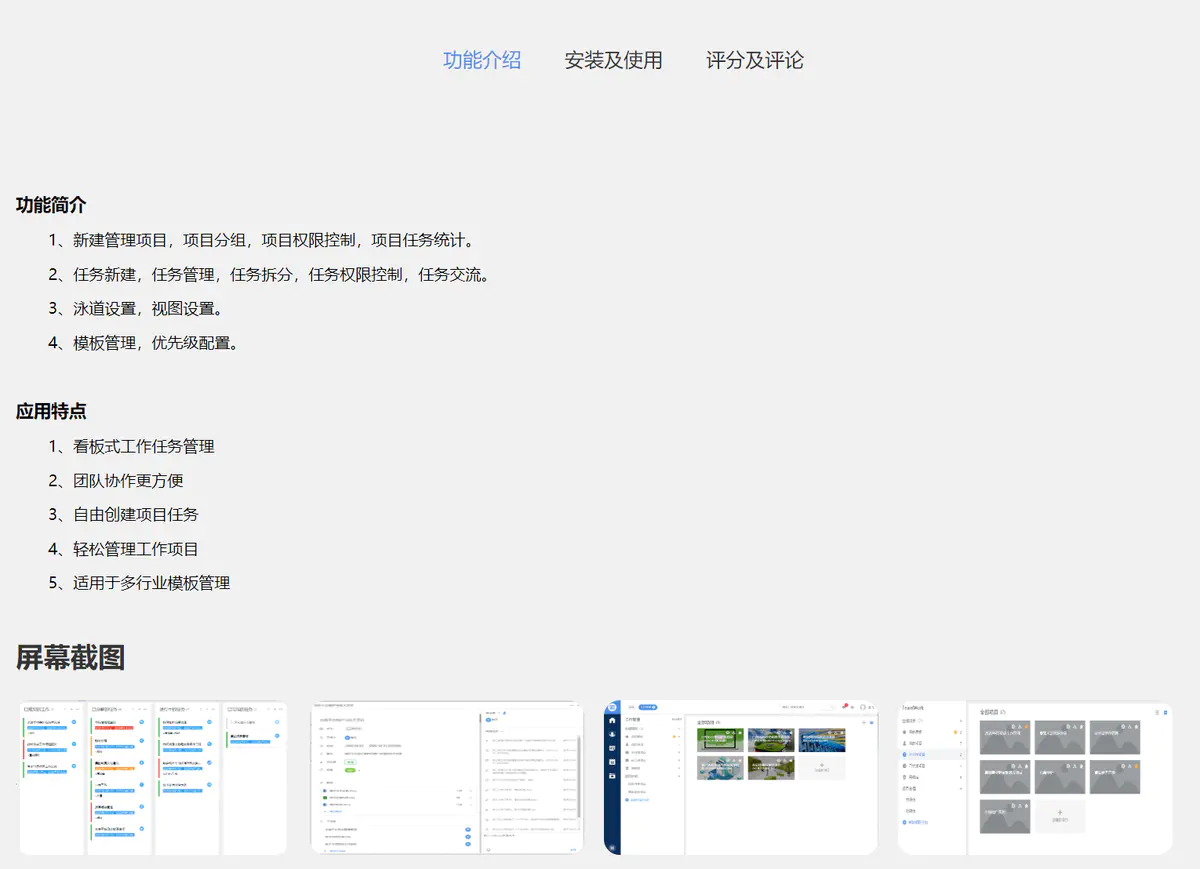 在功能下方,还带有功能介绍、应用特点、安装使用方法等栏,让用户能够最短时间里,理解这款办公应用的使用方法和使用价值。