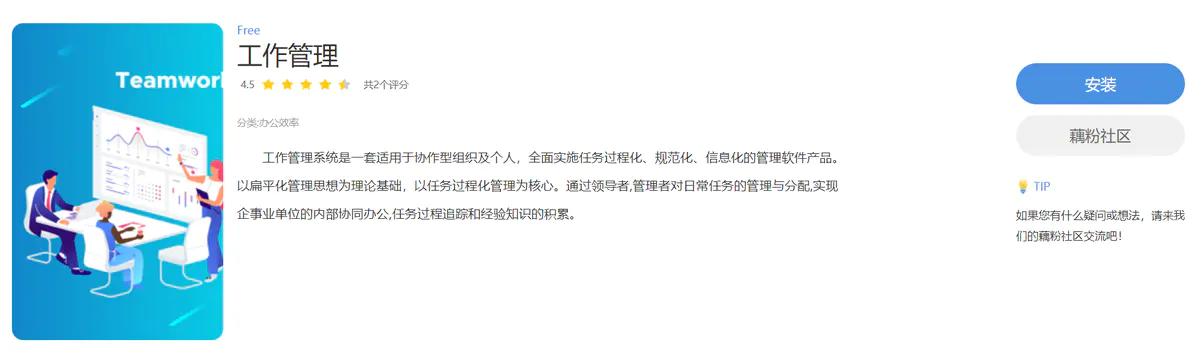 点进其中的应用(工作管理),可以在右上方选择安装,如果有任何疑问可以直接进入藕粉社区进行交流,在应用下方还有评分功能,可先从用户的评论中看出此应用是否值得安装。