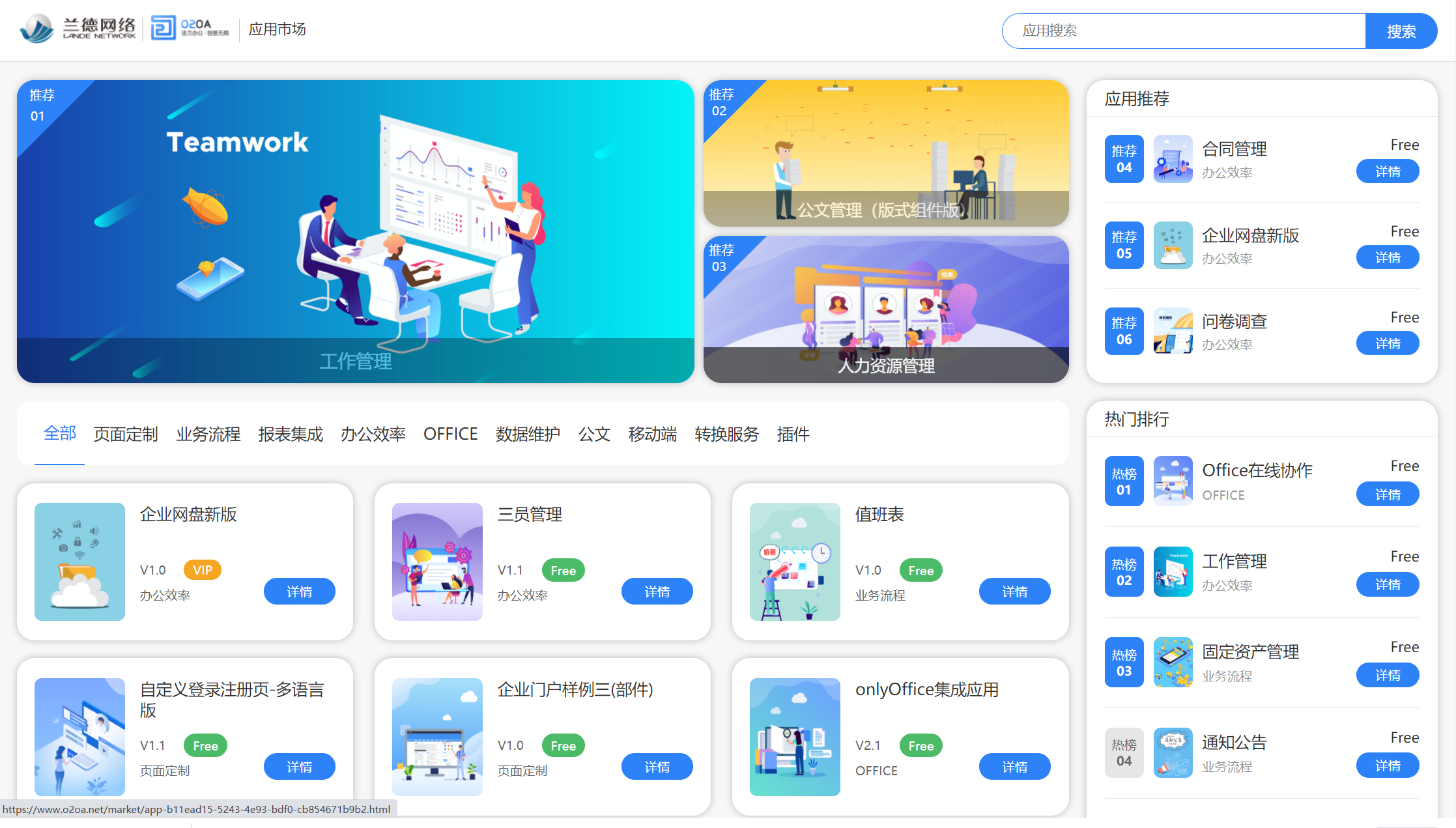 上图是O2OA应用市场界面,整体设计上简约干净,以商务风格为主,没有任何的多余项目。其中办公所需的各类应用都有涉及,并且还在持续更新中。