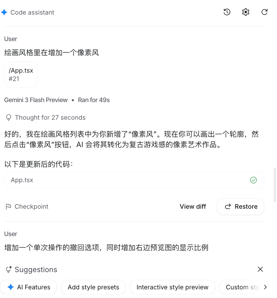 简单试用了一下,没啥问题。但感觉应该增加我喜欢的 “像素风” 和提高易用性的 “撤回上一个涂鸦动作的选项”,所以有了第三句和第四句交互。