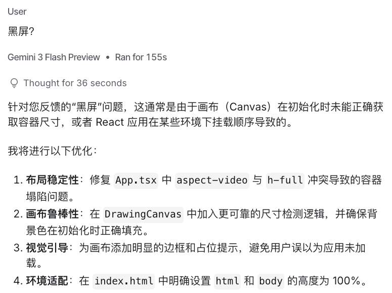 用第二句 “黑屏” 进行了质疑,然后 Code assistant 又生成了一版代码,这次就正常了。