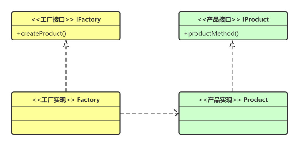 Factory:工厂接口,也可以叫 Creator(创建器),申明工厂方法,通常返回一个 Product 类型的实例对象