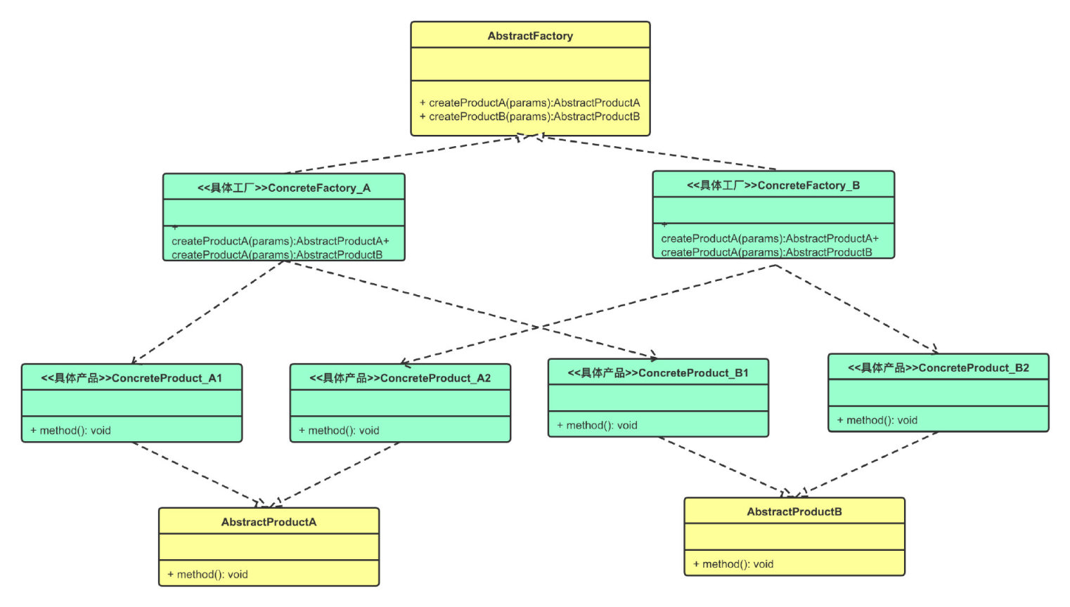 ConcreteFactory:具体工厂,实现抽象工厂定义的方法,具体实现一系列产品对象的创建