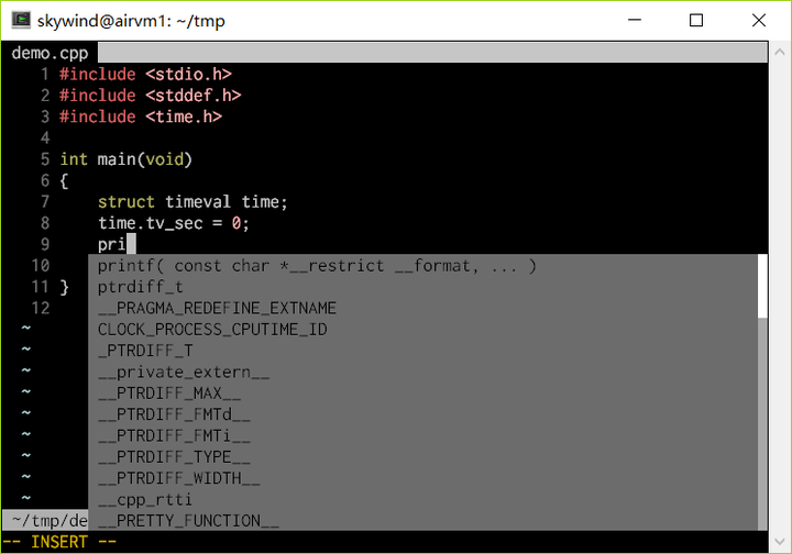 两个字符以后自动弹出的是基于符号的补全(当前所有 buffer 中收集到的符号),不是基于语义的补全,所以前面没有输入过 printf 的话,接下来输入了 pri 也不能自动语义补全为 printf: