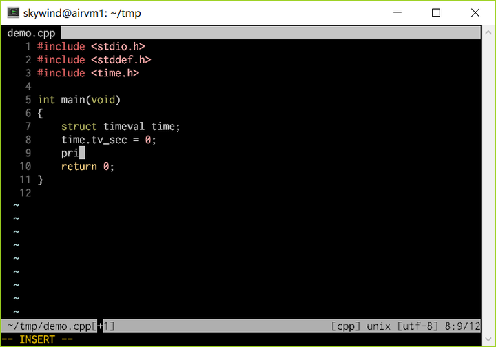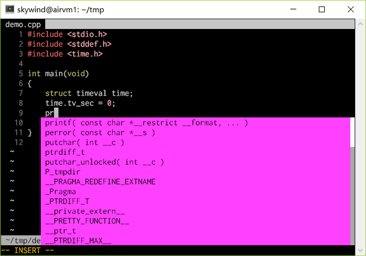 就是上面这个,括号里面的数字可以修改,这里我们默认输入两个字母才弹出。好了,接下来重启 Vim ,跑到刚才我们的小程序那里,输入 pr 后不用按任何键就自动弹出语义补全了: