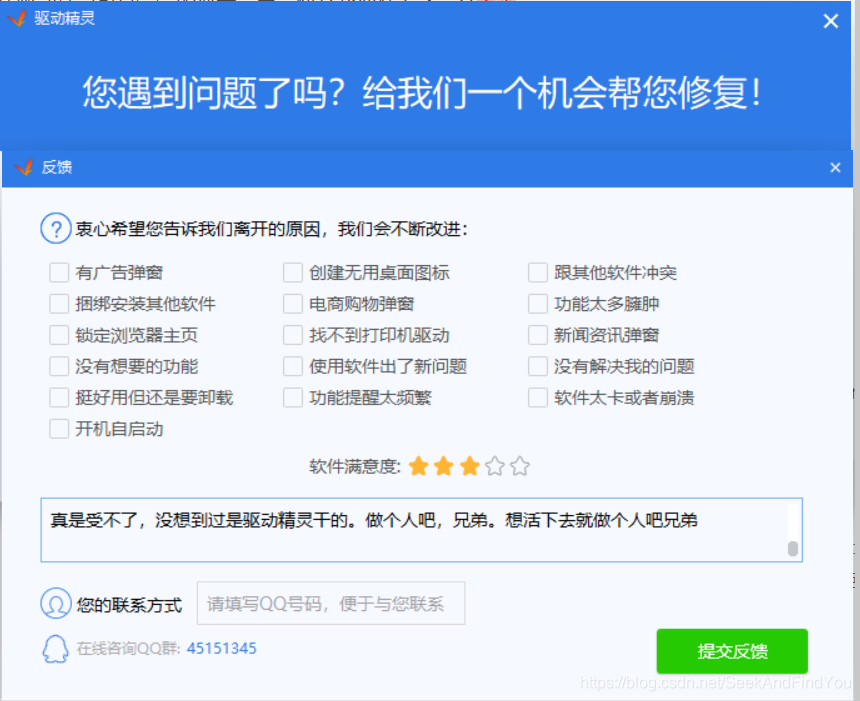 我很气氛,求你做个人吧,驱动精灵。卸载了你之后就没问题了,不是你干的是哪个干的。还好有博客这么好的东西在,不然很难知道是它。还要我的QQ,hhh,祝你越来越好,越做越大,生意兴隆。